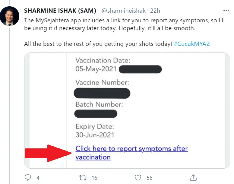 As for side effects, that differs from person to person. Jason reported feeling no side effects, which is what we all hope for, but Sharmine mentioned his arm felt sore. That is normal after a jab, however, if you do run into anything strange, there’s a link in MySejahtera for you to report your symptoms.