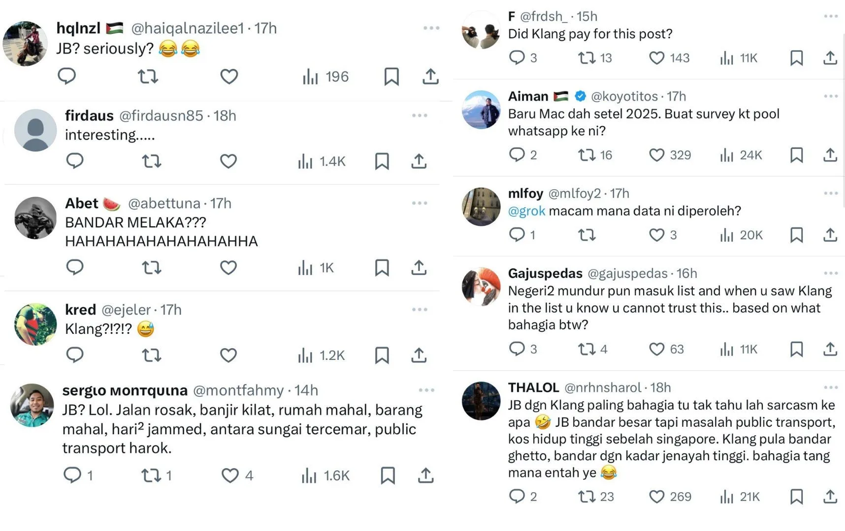 Many Malaysians took to social media to question the list’s accuracy, with one user jokingly asking if Klang had paid for the ranking. Another user questioned the basis of the rankings, pointing out that Klang struggles with crime while Johor Bahru faces high living costs and poor public transport. Most of the reactions reflect doubt and criticism, with many arguing that the rankings do not align with the daily realities faced by residents.