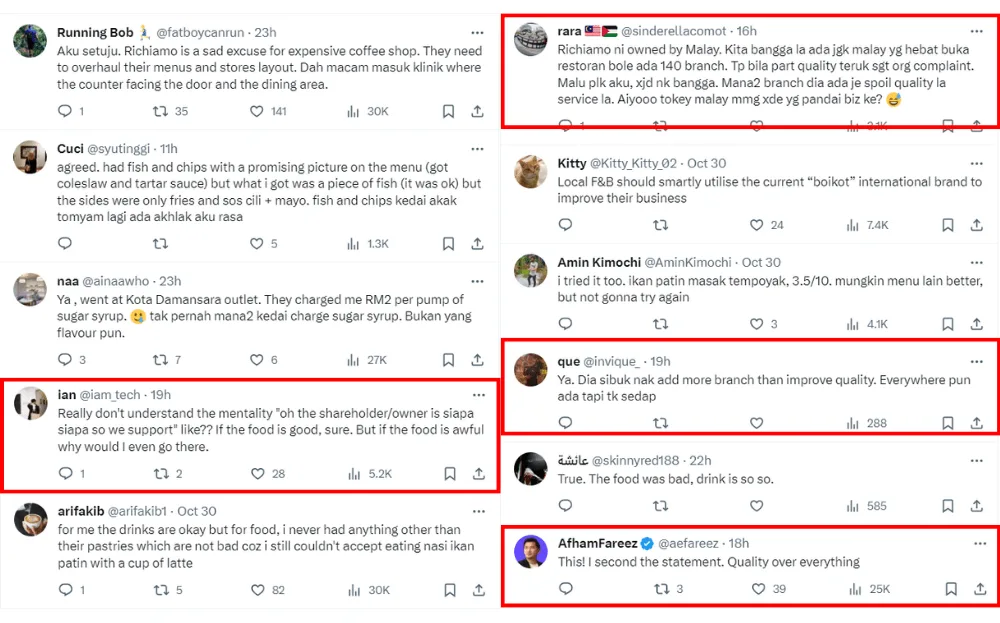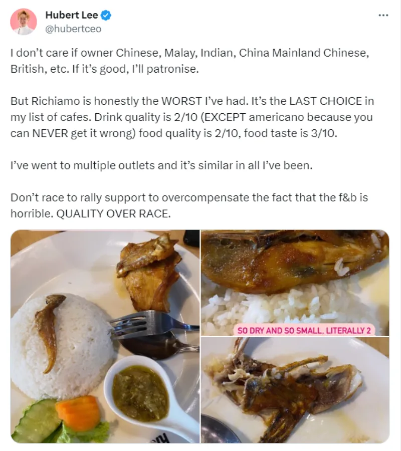 The tweet also led to netizens debating whether supporting local brands means overlooking the quality. One Richiamo critic said he would patronise a store regardless of the origin or the ownership if the quality is good. However, because of his disappointment in Richiamo’s quality, he won’t support the cafe even if it’s a homegrown coffee chain. He also added, “Don’t (use) race to rally support to overcompensate the fact that the F&B is horrible. Quality over race.” A few others supported his views and criticised the mentality of buying a local brand even if the product is terrible.