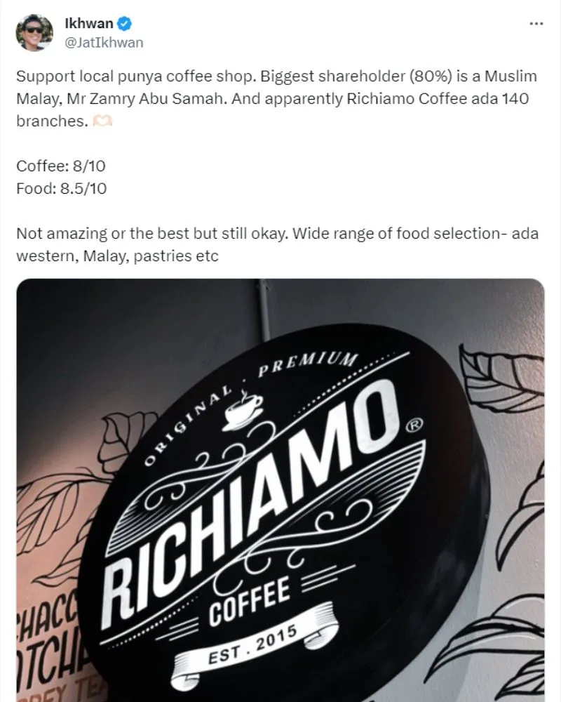 Following the recent boycott towards Starbucks Coffee, many Malaysians have shared suggestions of which homegrown coffee chain they can patronise instead. Apart from the suggestions of ZUS Coffee, San Francisco Coffee and even Bask Bear, a Malaysian recommended the local cafe chain Richiamo and gave the coffee shop a rating of 8 over 10 for their coffee.