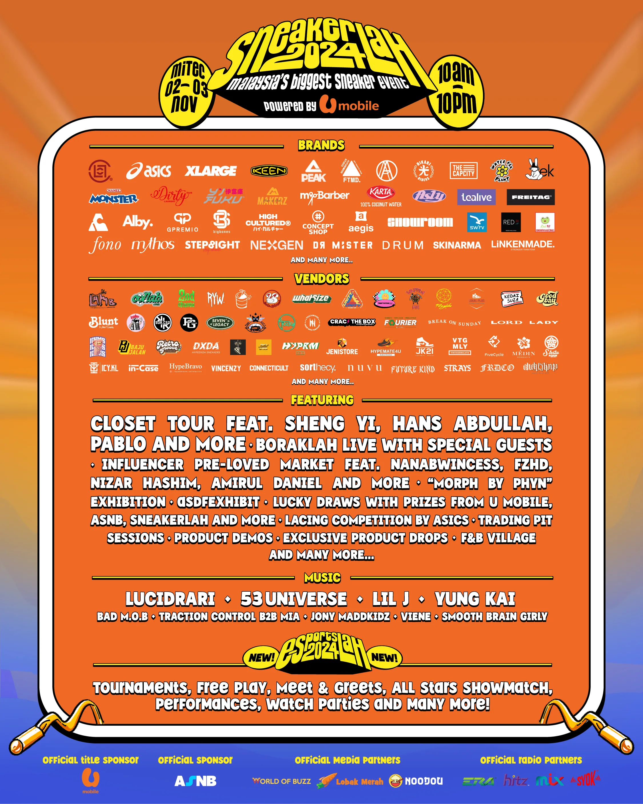 #SneakerLAH2024 is a ticketed event with General Admission pre-sale tickets priced at RM30, and VIP tickets at RM80. VIP ticketholders are entitled to exclusive early entry to the event two hours before General Admission entry, access to designated express entry lanes, and complimentary SneakerLAH official socks. SneakerLAH tickets allow you access to both SneakerLAH and E-SportsLAH, and customers can also purchase an E-SportsLAH upgrade add-on to their ticket, priced at RM20, which entitles them to exclusive perks including in-game Mobile Legends: Bang Bang (MLBB) rewards valued up to US$10, E-SportsLAH lucky draw entry, exclusive merchandise, and more.