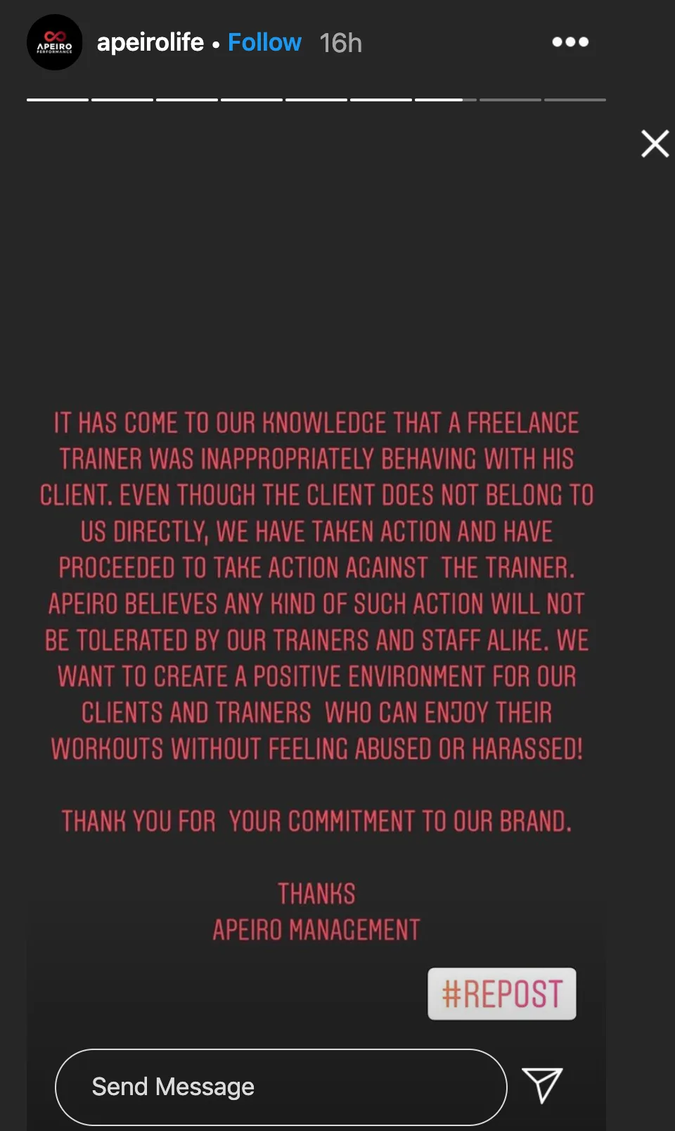 In the meantime, Apeiro Performance released a statement to address the issue on Instagram Story. The health centre explained that they do not tolerate such inappropriate behaviour and has since banned the freelance trainer.