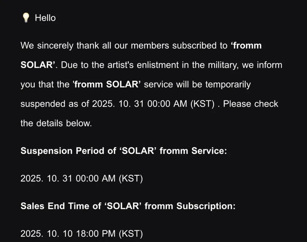 Over the weekend, an announcement was posted on Solar’s official Fromm account to inform fans that the idol’s Fromm fan messaging service would be temporarily suspended “due to her upcoming enlistment”. The notice also stated that the suspension would begin on 31st October 2025 at midnight (KST). As expected, the announcement has sparked shock and confusion among MOOMOOs (MAMAMOO’s fans) around the world.