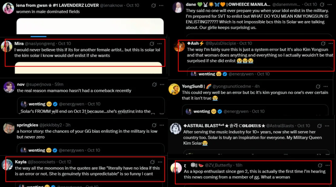 Many fans suspected that the announcement could have been an error by the platform, suggesting that it might have accidentally used a template intended for male idols. Others made light of the situation, joking that Solar would be making history as the first female idol to enlist in the military. Some even said they wouldn’t be surprised if the singer did enlist, noting that she’s known for being rather unpredictable. And since women in South Korea can volunteer to serve in the military, it wouldn’t be entirely impossible for the “Floating Free” songstress to enlist.