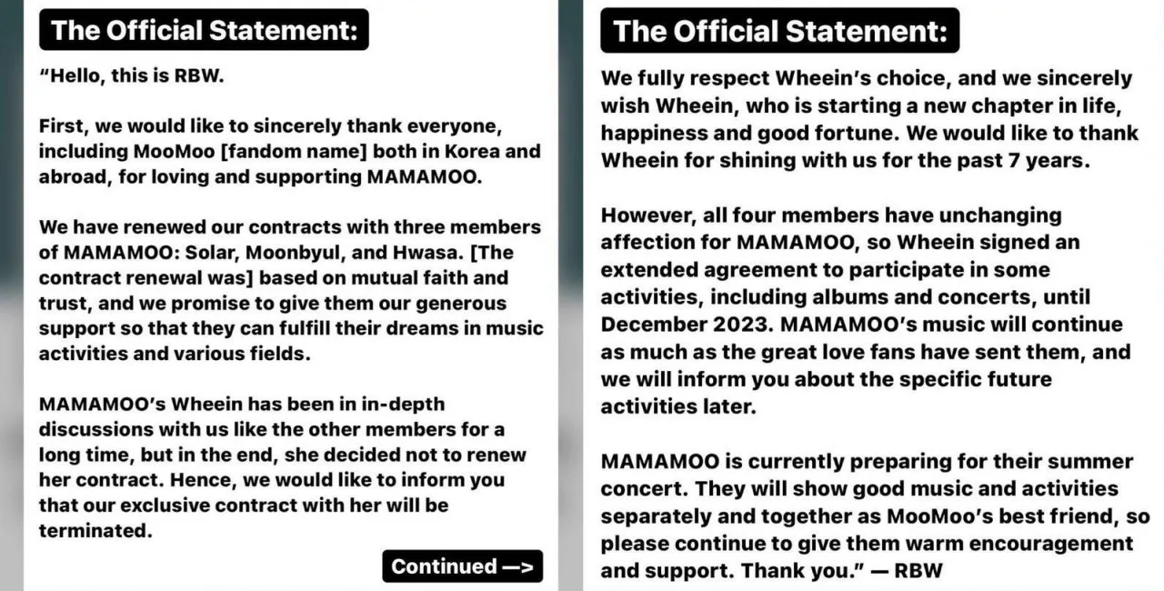 RBW has confirmed that the 26-year-old songstress will not be renewing her contract. However, it was also revealed that Wheein has agreed to continue participating in Mamamoo’s group activities until December 2023.