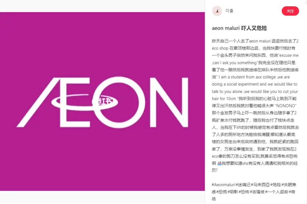 The lady claimed she had been shopping alone at AEON Maluri yesterday (13th March) when she was approached by a man. He allegedly spoke English, had blonde hair and looked to be about 30 years old. The man then asked her for a bit of her time, which she ignored. However, he continued: “I am a student from XXX college. We are doing a social experiment and we would like to talk to you alone. We would like to cut 10cm of your hair.”