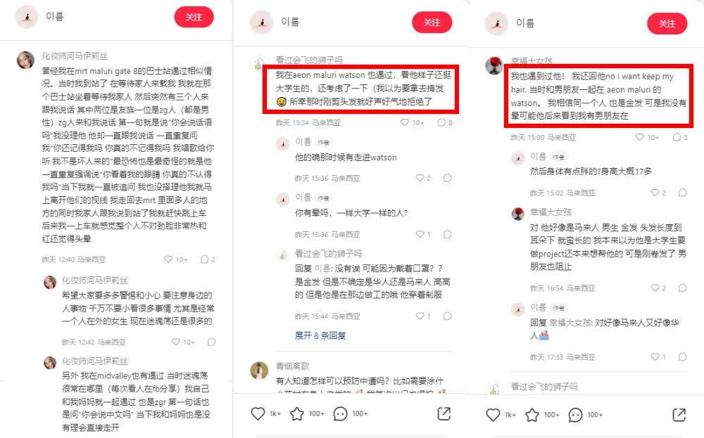 The lady uploaded a post on 小红书 (Xiao Hong Shu) warning others of a blonde-haired man. She claims he had almost bewitched her by asking her to donate some of her hair.