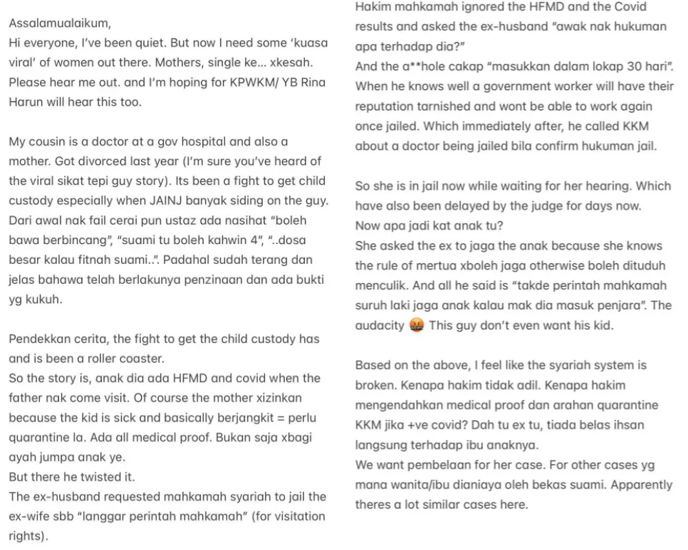 The FB user revealed that the ex-husband had expressed his desire to visit his child. However, the mother denied his request as the child was recovering from HFMD (Hand Foot Mouth Disease) and Covid-19. His ex-wife even provided all the necessary documents to prove that their child was indeed unwell but he refused to accept the situation and asked the Syariah court to put her in jail for “denying his visitation rights”.