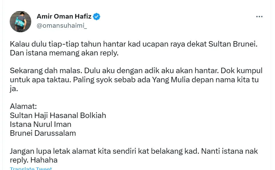 The man, named Amir Oman Hafiz, tweeted, “Back then, I used to send greeting cards to the Sultan of Brunei every year. And the palace would reply. Nowadays I’m lazy. My sibling and I used to post them. We will add the cards in our collection. The most shocking part is seeing the salutation ‘Yang Mulia’ written in front of our names on the card.”