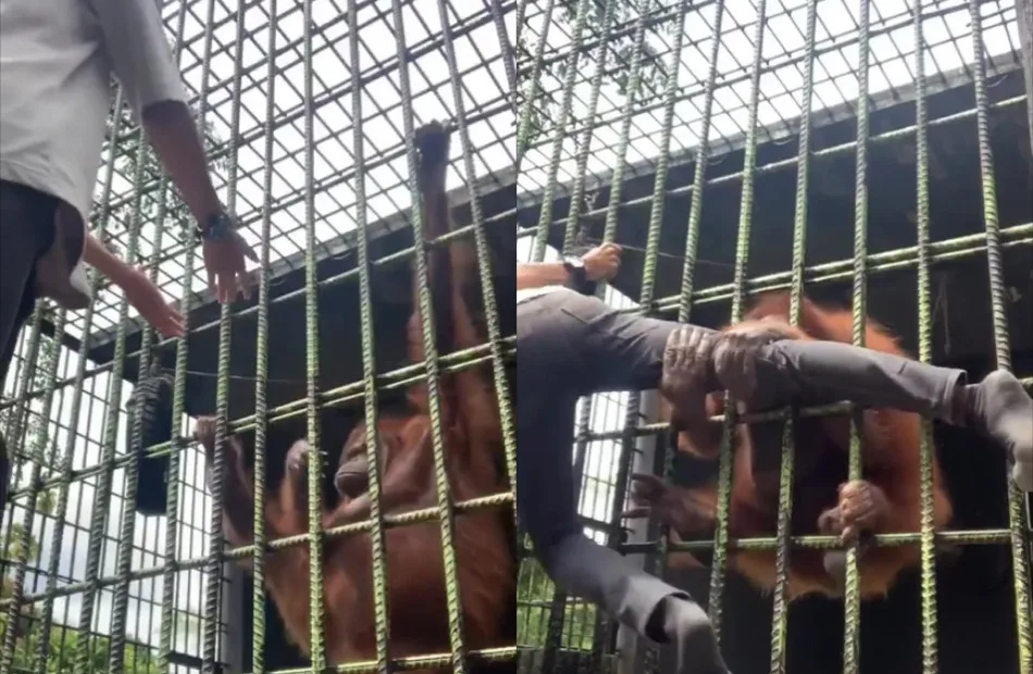 In the video, the man was seen panicking and screaming for help as the ape grabbed him by the shirt. We then see the man’s friend coming over to help free him from the Orangutan’s grasp only for it to grab him again by the leg. The two friends continued to panic and struggled to escape the great ape.