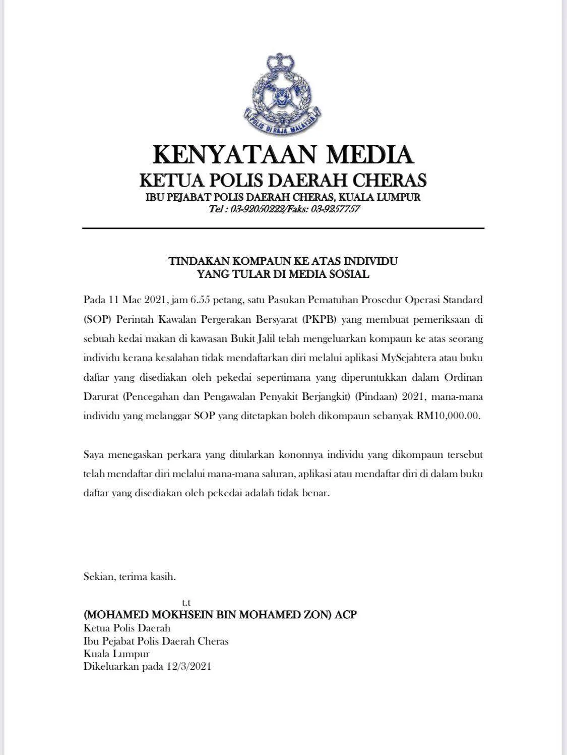Not long after the story about the man came to light, Cheras district police chief, ACP Mohamed Mokhsein Mohamed Zon, confirmed that the individual was issued with the RM10,000 compound for violating CMCO SOPs. According to the police official, the person did not register his details at a restaurant he visited in Bukit Jalil.