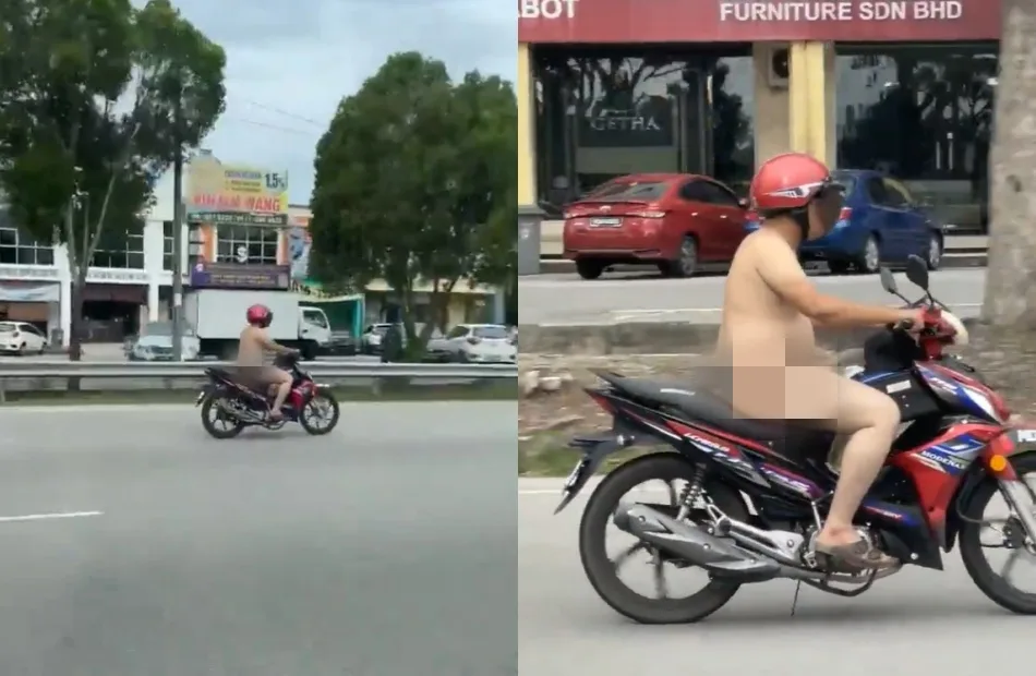 Twitter page @isusemasamalaysia posted a video submitted to them by an onlooker showing a man riding his motorcycle while wearing nothing but sandals and a helmet. According to the video’s caption, the incident took place at the AMJ (Alor Gajah–Melaka Tengah–Jasin) highway nearby Taman Semabok Perdana, Melaka.