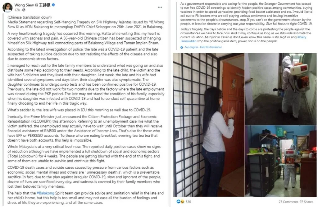 According to Balakong’s Assemblyman Wong Siew Ki (王诗棋), the family had already been facing financial difficulties. Having to deal with Covid had supposedly been the last straw for the deceased.