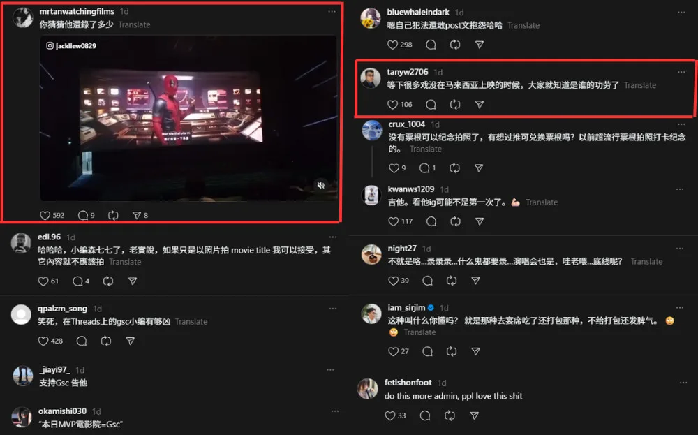 The complaint elicited a stern response from GSC, which reads, “Record Record Record, Record for what?”. Netizens were quick to agree with GSC’s statement, with user @/tanyw2706 commenting, “When many movies aren’t released in Malaysia, everyone will know who’s responsible”. A Thread user also pointed out that this wasn’t this man’s first time filming in the cinema illegally, with user @/mrtanwatchingfilms linking a past post from Jack, which looks like a part of “Deadpool & Wolverine”.