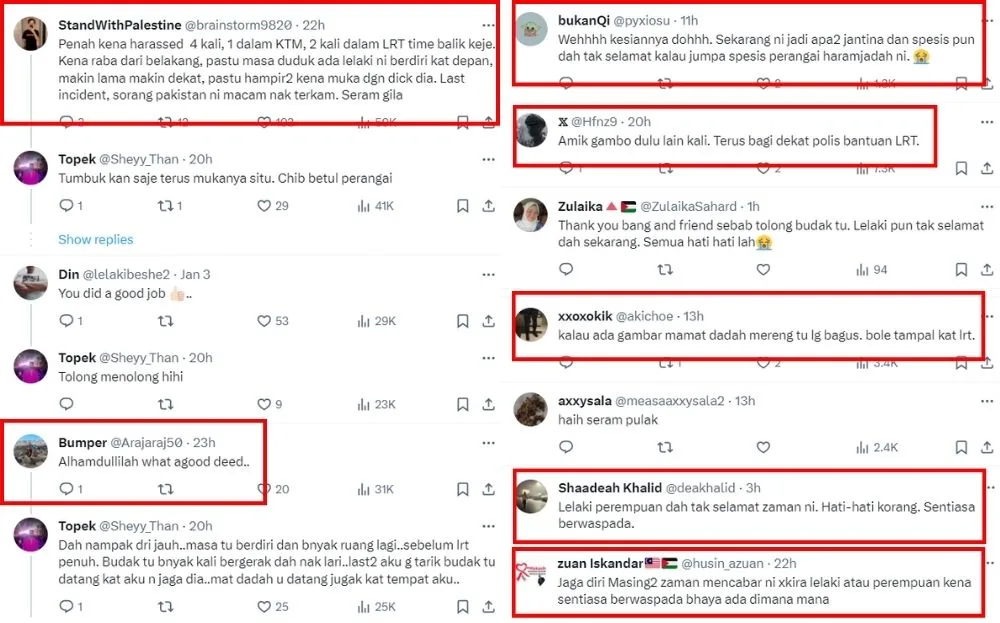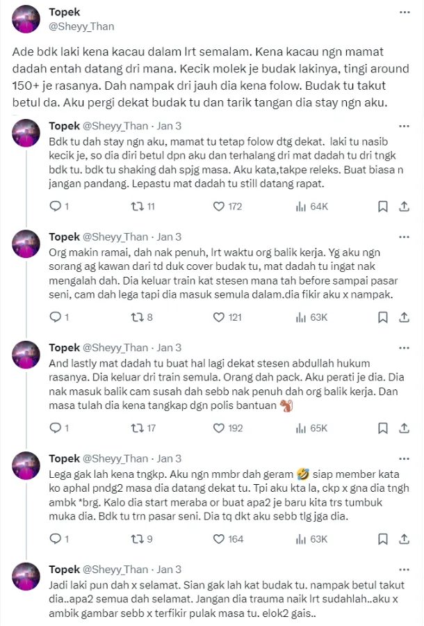The man noted that the incident happened during peak hours, as many passengers were getting on the train. He was initially relieved when he noticed the harasser getting off the train, but it was merely a trick as the man quickly got back on the train. Finally, the man was caught by the auxiliary police at LRT Abdullah Hukum when he attempted the same trick but failed due to the crowd. Thankfully, the boy got down safely at LRT Pasar Seni.