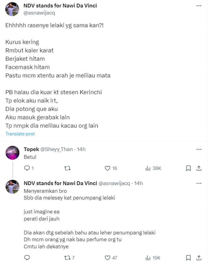In a response to another Twitter user, the man revealed more details about the stranger. According to the tweet, the man is skinny with reddish-brown hair and wears a black jacket and face mask. The netizen noted that the man seemed disorderly and would stare at and approach men on the LRT on the Kelana Jaya line, especially at the Kerinchi, Abdullah Hukum and Pasar Seni stations.