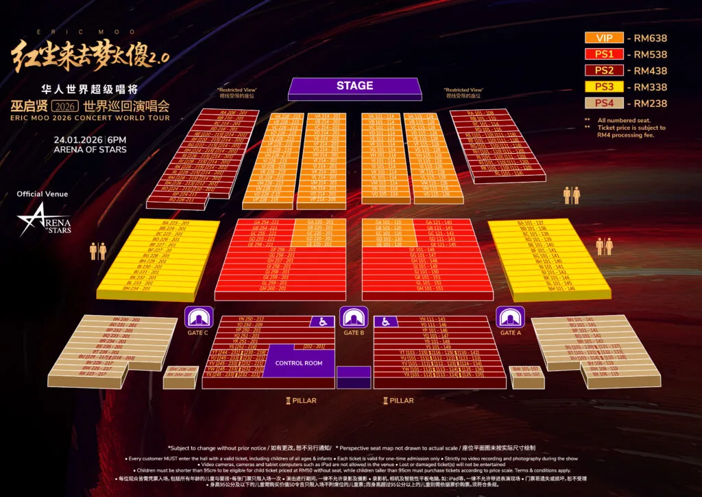 - Ticket Prices: VIP: RM638, PS1: RM538, PS2: RM438, PS3: RM338, PS4: RM238