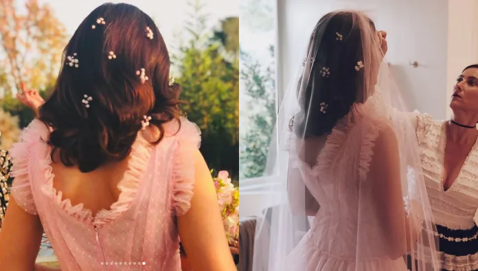 “Mandy’s pink dream wedding hair was inspired by her custom layered Rodarte dress. The perfect pale pink hue of the dress adorned with babies breath florals inspired a whimsical and romantic feel, while still remaining classic,” Garnier Fructis hairstylist Ashley Streicher told Daily Mail.