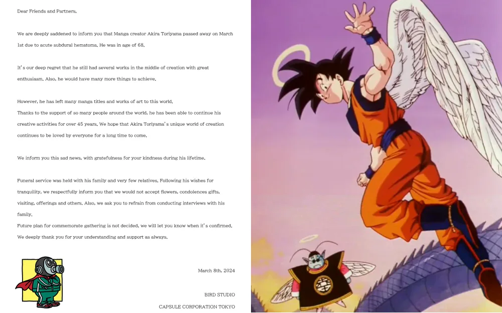 According to a post made by “Dragon Ball” official’s account on X (formerly Twitter), Toriyama Akira had passed away at age 68 due to an “acute subdural haematoma (blood clot on the brain)”. Fans have since gathered online to share their condolences and mourn his passing.