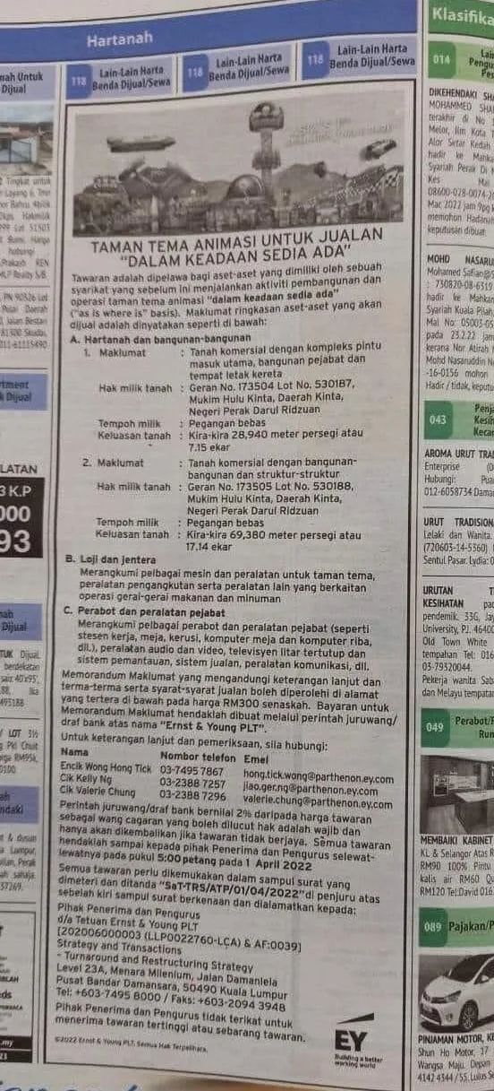 The column put up by Ernst And Young (EY) Firm has advertised MAPS as a property that is to be auctioned on the basis of “as is where is”. In other words, sold along with the rides, main entrance gate, offices, cafes, etc. with no renovations done.