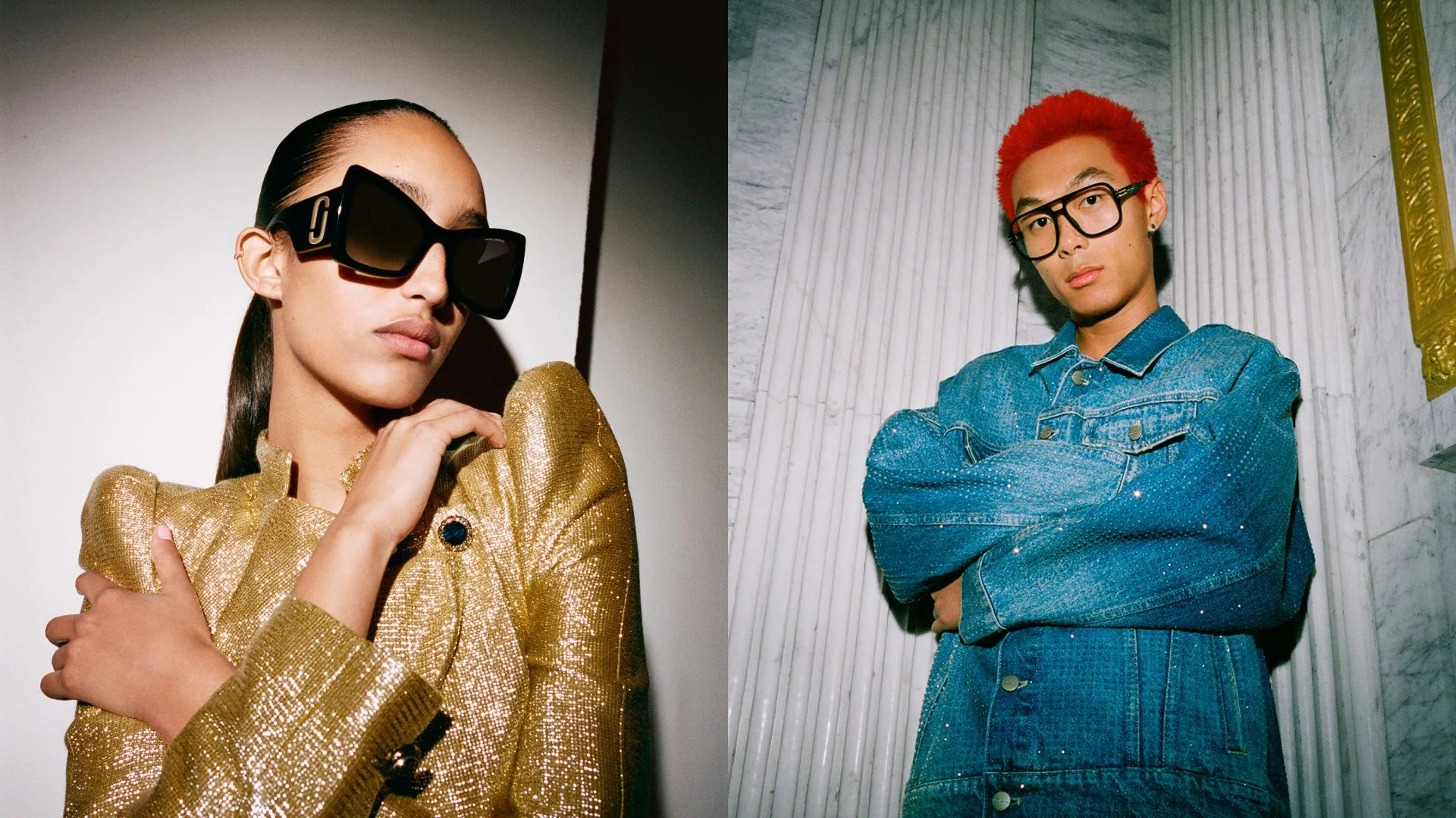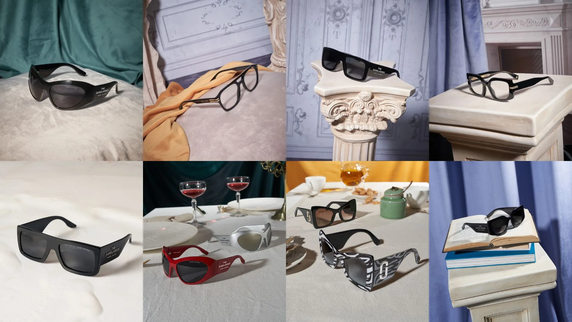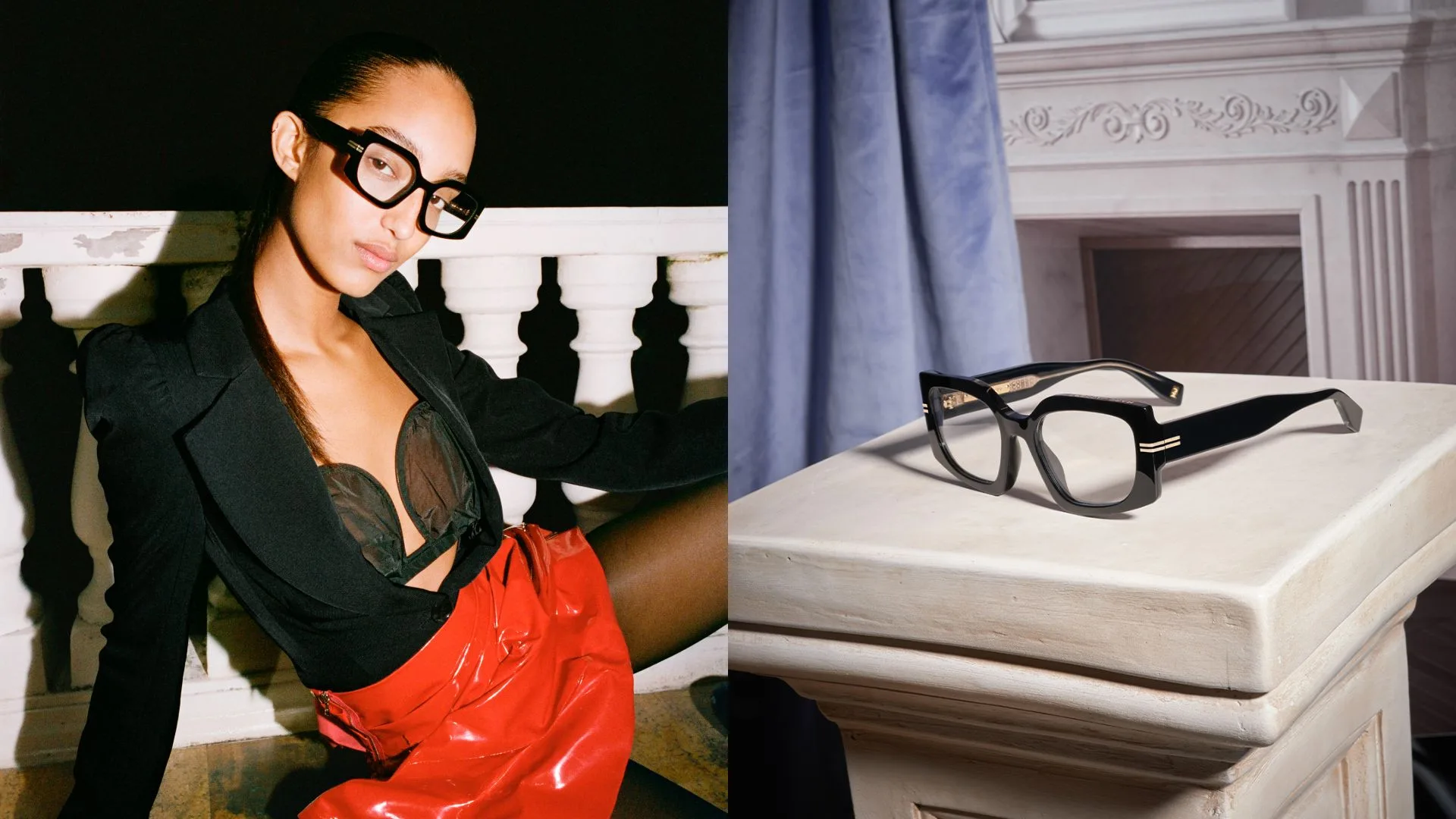 The images fascinate with an unexpected contrast between the neoclassic interiors of marble surfaces and rich decorations with the contemporary vibe of the sunglasses and optical frames.