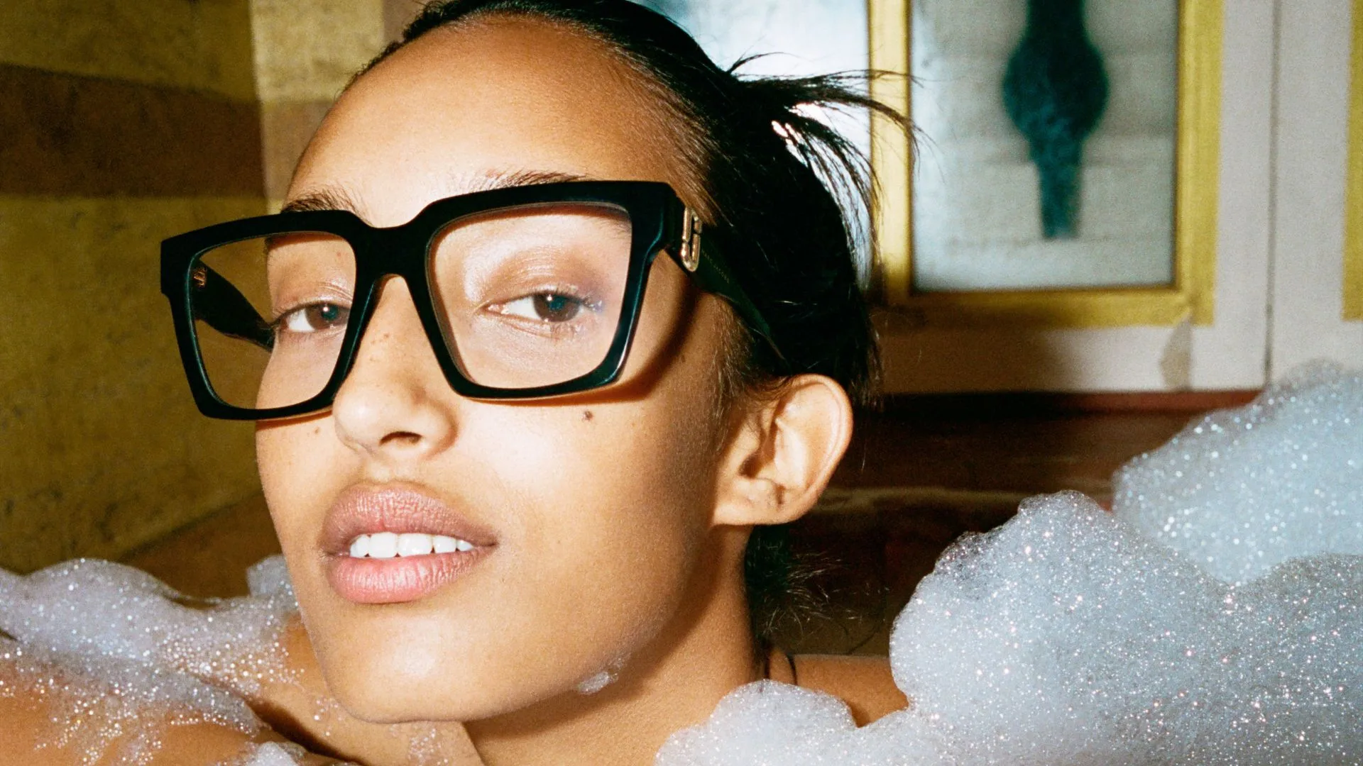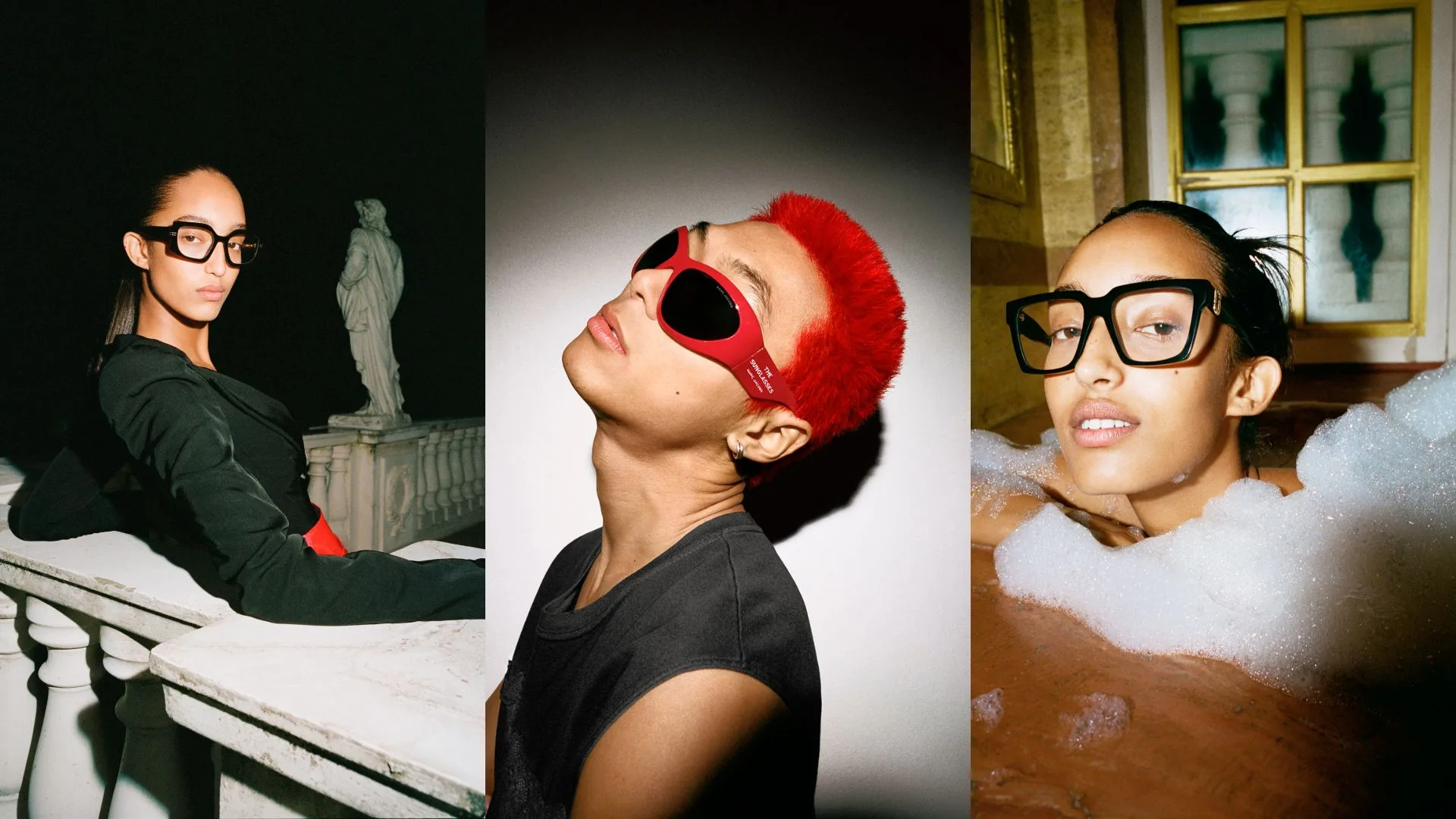 The Eyewear Campaign encapsulates the irreverent and unexpected spirit of the brand with eye-catching and fresh portraits capturing the talents while moving among marble columns, playing on an elegant terrace, or playfully taking a bath, in a decadent yet opulent atmosphere.