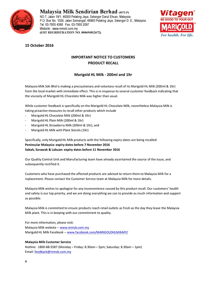 The recall affects Marigold HL Milk products that come in 200ml and 1-litre packages with an expiry date of up till 7th November 2016 for Peninsular Malaysia and 11th November for Sabah, Sarawak, and Labuan.