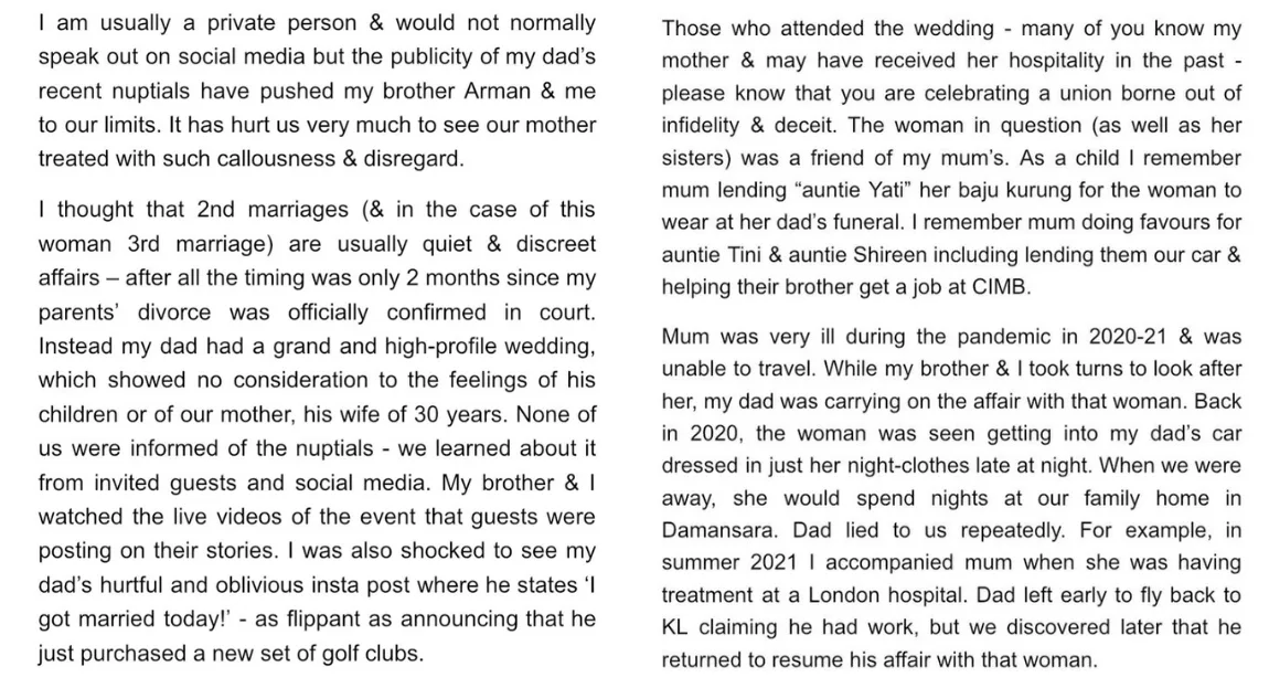 Marissa starts her post by slamming her father for proudly holding a high-profile ceremony just two months after divorcing her mother, Dato’ Azlina Aziz. She revealed that none of her family members were informed about the ceremony and had to find out through guests and social media. In her post, Marissa called the marriage “a union borne out of infidelity and deceit”, revealing that Nazir and Yati have been having an affair for years. Marissa also revealed that Yati was a friend of her mother and that her mother had done many favours for Yati and her siblings, even helping Yati’s brother to land a job at CIMB Bank.