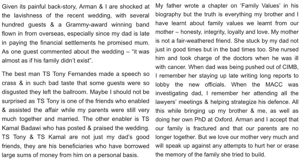 The post continues with Marissa calling Nazir’s friends Tan Sri Tony Fernandes and Kamal Badawi, son of former premier Abdullah Badawi, saying they had enabled and assisted in her father’s affair with Yati. She also revealed that the two had been borrowing large sums of money from Nazir “on a personal basis”. Marissa’s post ends by sharing how her mother had stuck with Nazir through his bad times, even nursing him when he was diagnosed with cancer and attending lawyer’s meetings when he was investigated by the Malaysian Anti-Corruption Commission (MACC). She says that despite understanding that the relationship between her father and mother has ended, she and her brother will continue to speak up against any attempts to hurt her mother.