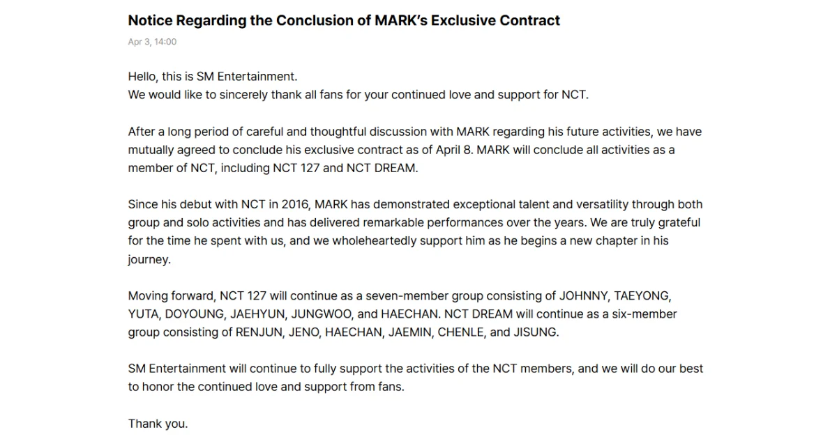 SM Entertainment shared the news earlier today (Friday, 3rd April 2026) through NCT’s Weverse communities. The statement writes, “After a long period of careful and thoughtful discussion with Mark regarding his future activities, we have mutually agreed to conclude his exclusive contract as of 8th April (Wednesday). MARK will conclude all activities as a member of NCT, including NCT 127 and NCT DREAM.”