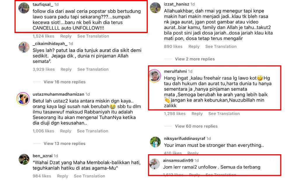 Despite her pretty pictures, many of the singer’s fans were shocked by her new look, particularly the lack of hijab. Previously, Masya was slammed for wearing short skirts and crop tops while still donning a head cover. Despite being mostly covered up by wearing leggings and arm covers, netizens were still unhappy with her contradicting fashion choices, even leaving comments telling her to “just remove her headwear”.
