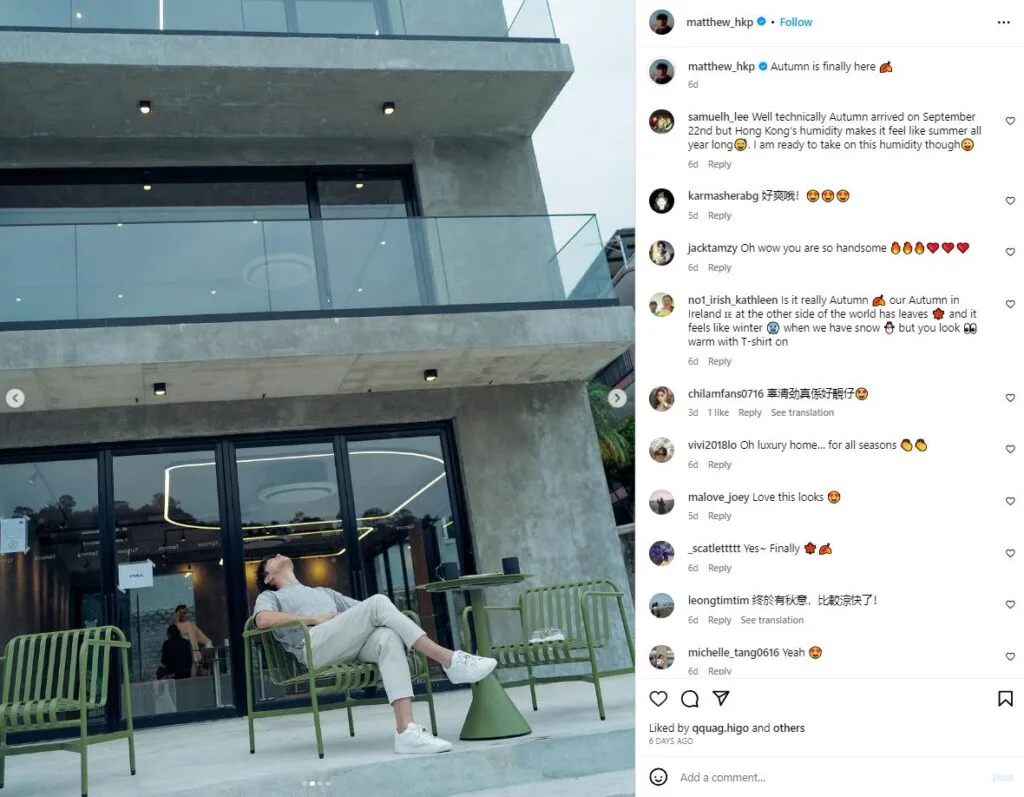 In September, Matthew revealed that he was seeing public relations company founder Sarah Miu after breaking off his six-year relationship with actress Rebecca Zhu (朱晨麗). He later shared more about his relationship with Sarah in an interview with 香港01. The Hong Kong celeb shared he felt comfortable and relaxed with her, adding they got along well and had no barriers between them.