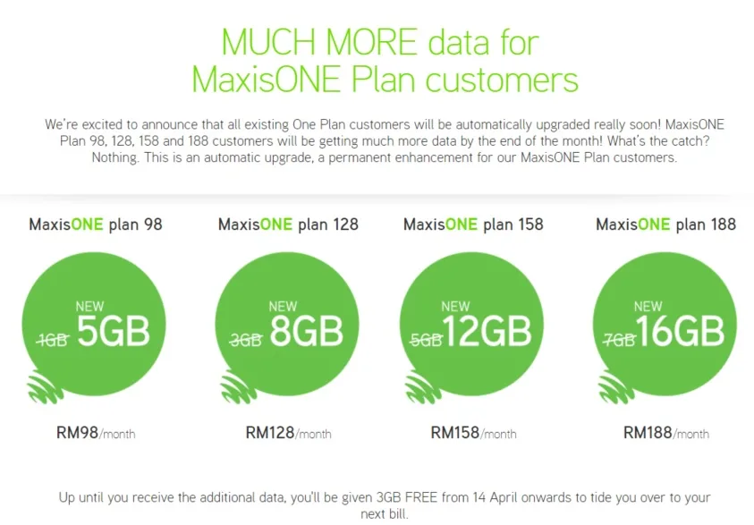 MaxisONE subscribers with 1GB plan will be upgraded to 5GB, 3GB plan will be increased to 8GB, and so on (you can refer to the chart below). The upgrade will only be available to both existing and new customers later this month.