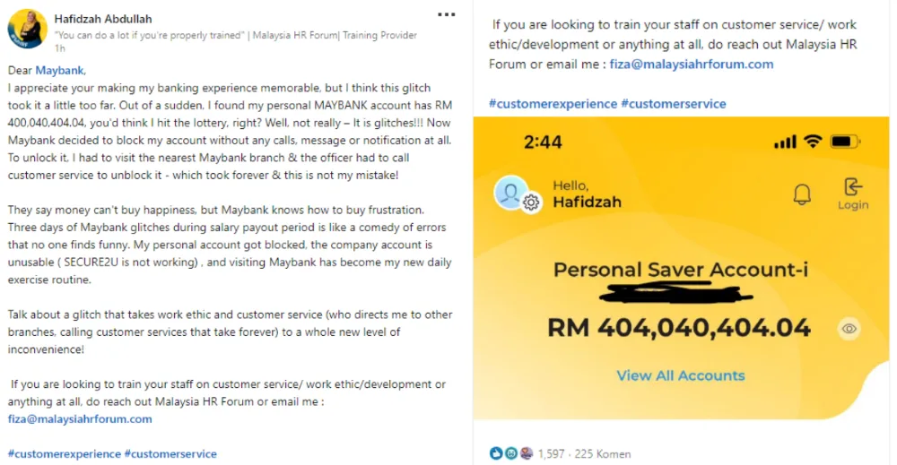 “Dear Maybank,” she started blithely in her post, uploaded on 29th November. “I appreciate your making my banking experience memorable, but I think this glitch took it a little too far.” According to Hafidzah, she’d opened the app to see her personal account deposit had increased to a total of RM404, 040,404.04. “You’d think I won the lottery, right?” she stated. “Well, not really – It is glitches!!!”