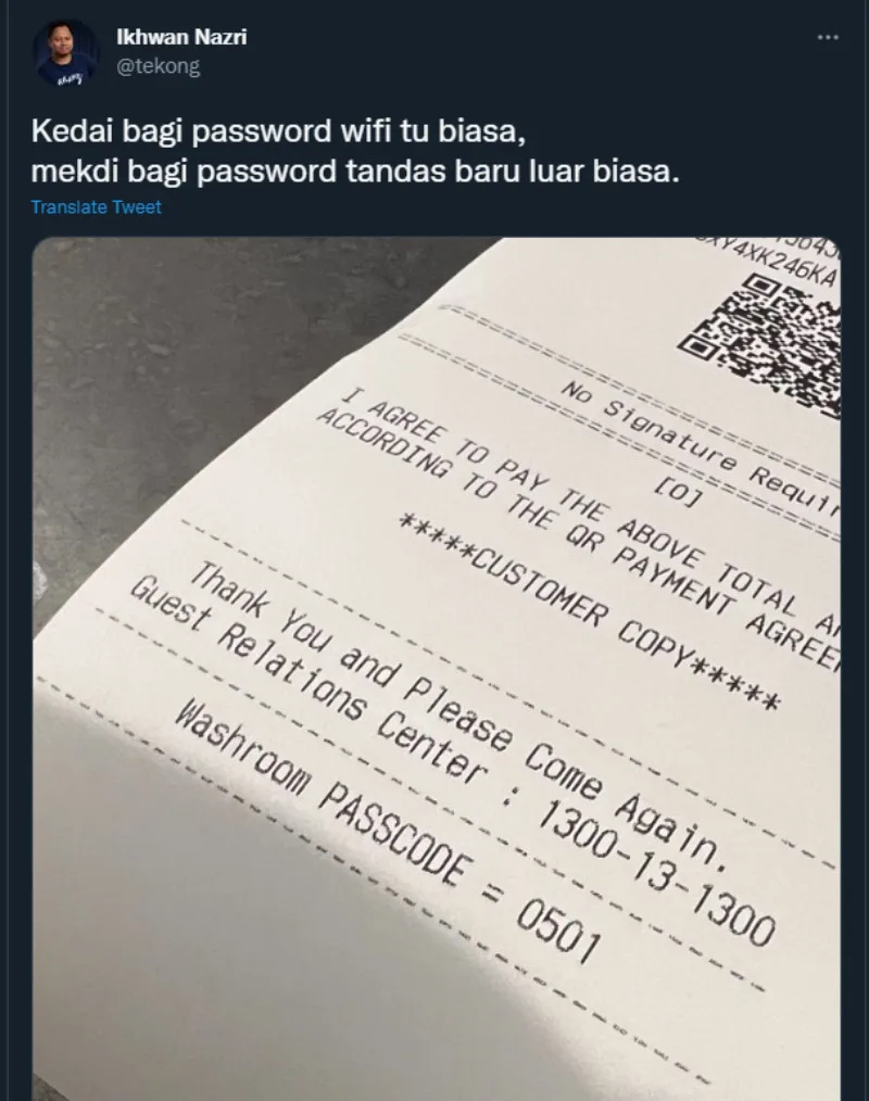 A Twitter user who goes by @tekong or Ikhwan Nazri posted a photo over the weekend of their recent visit to a Mcdonald’s outlet in Kuala Lumpur. The photo is of a receipt with a caption that reads, “It’s normal for shops to give the Wifi password to paying customers. It is however not normal for Mcdonald’s to give passcodes to use the restrooms”.