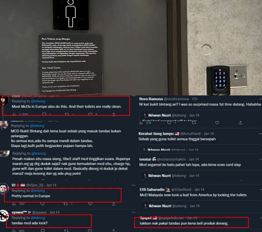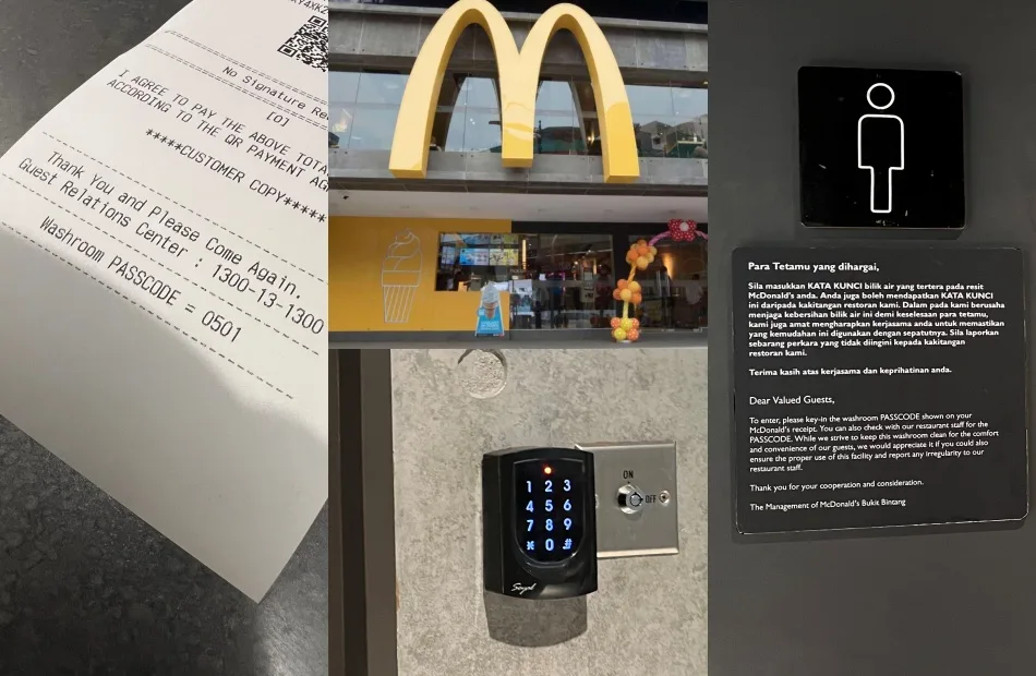 As you can see at the bottom of the receipt in the photo, there is apparently a passcode for paying customers to input in order to use the restaurant’s restroom. When another netizen asked if their restrooms are really locked, the Twitter user replied with a photo of the male restroom with a keypad located next to it. If you’re wondering which outlet this Mcdonald’s is located, according to the Ikhwan, it is actually the Bukit Bintang outlet.