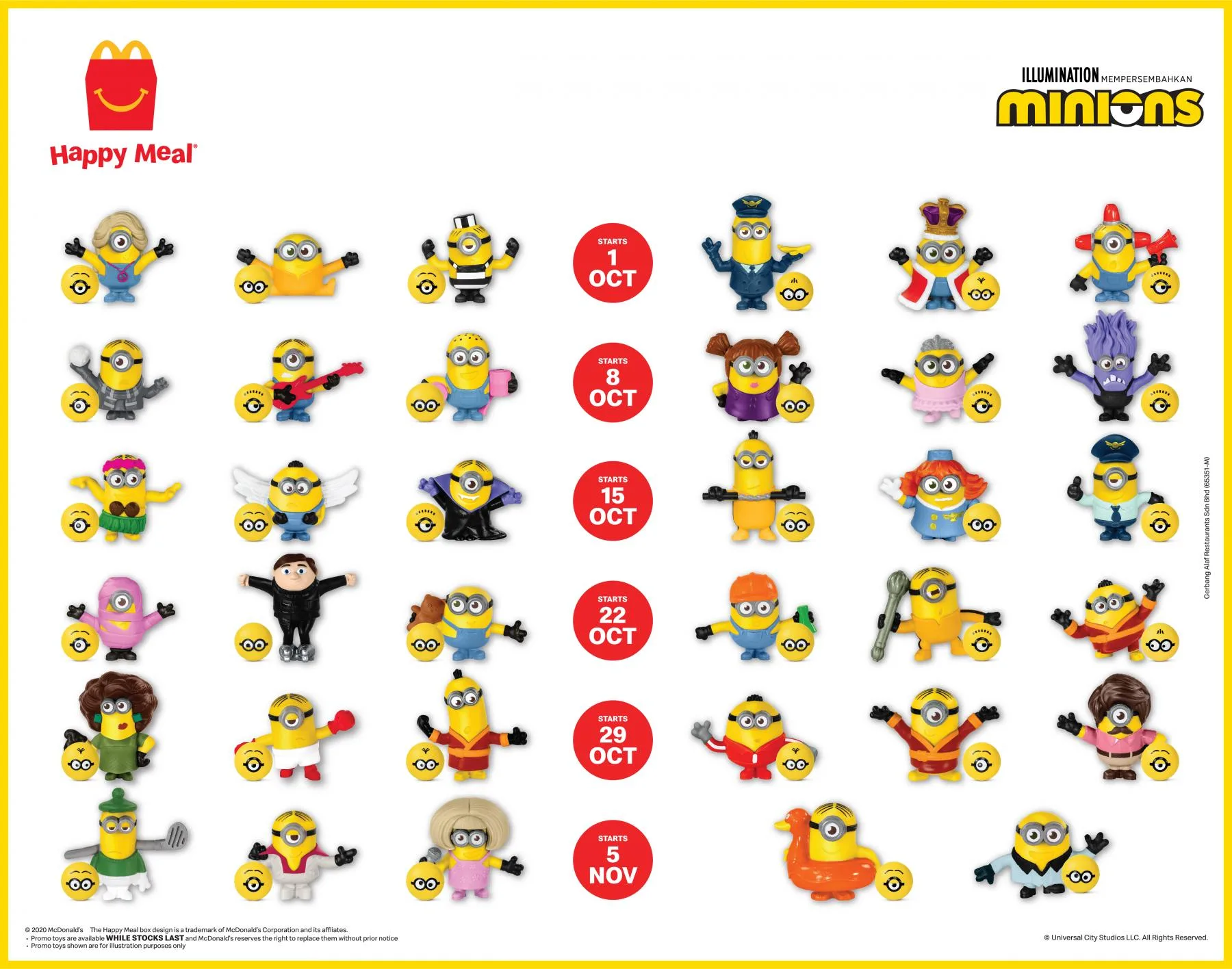 Take a look at the poster below to find out exactly which Minion toys are available each week. Good luck trying to collect all 35 of these cute creatures. Don’t forget, there are also exclusive golden minions up for grabs.