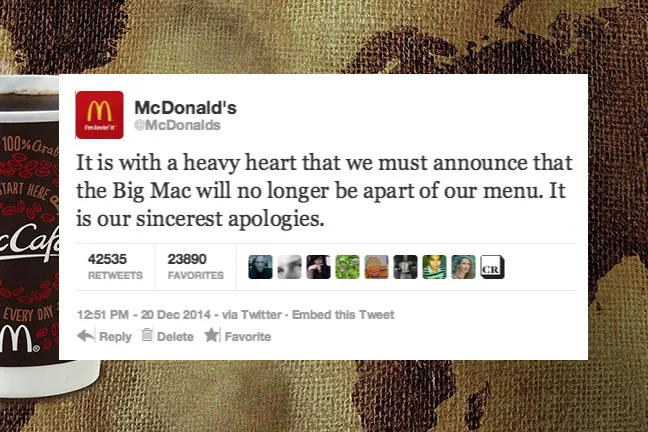 In the past week, a Daily Buzz Live post has been going viral, causing panic amongst McDonald’s lovers and unleashing an Internet frenzy. The post, titled, “McDonald’s Removing Big Mac, Apple Pies And Eliminating Large Size Options”, claimed that the fast food giant announced that it will be phasing out 8 menu items starting from early 2015. The site even went as far as posting up a screenshot of a fake tweet from the McDonald’s account that read, “It is with a heavy heart that we must announce that the Big Mac will no longer be apart of our menu. It is our sincerest apologies.”