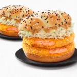 The Hokkaido Salmon Burger comes with “a panko breading patty made with delicious Salmon from Hokkaido, shredded white cabbage, sliced onions and roasted sesame mayo, all sandwiched between a soft black and white sesame bun, indulge in the pure taste of Hokkaido”.