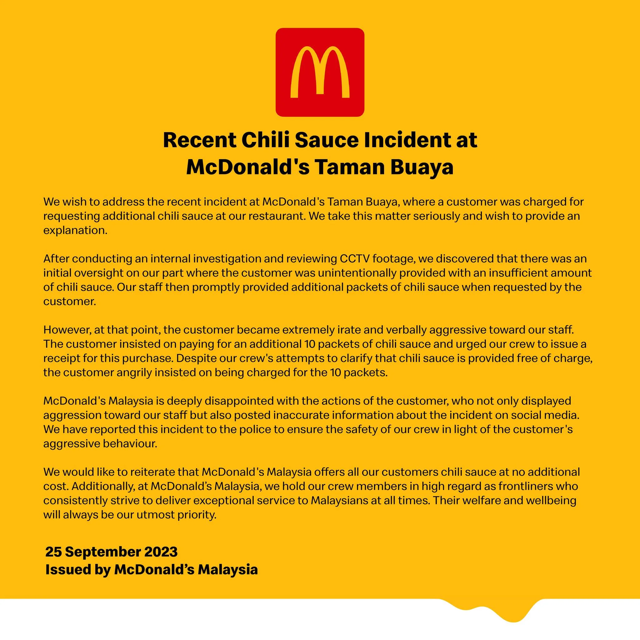 According to the statement, the customer did not receive enough chili sauce packets with his order and had requested extras, which a staff promptly provided. However, the customer then became verbally aggressive towards the staff member. He also insisted on paying for the condiments and receiving a receipt despite staff assuring him that they were free of charge. The customer then published the receipt on social media under the guise that he was forced to pay for the condiments.