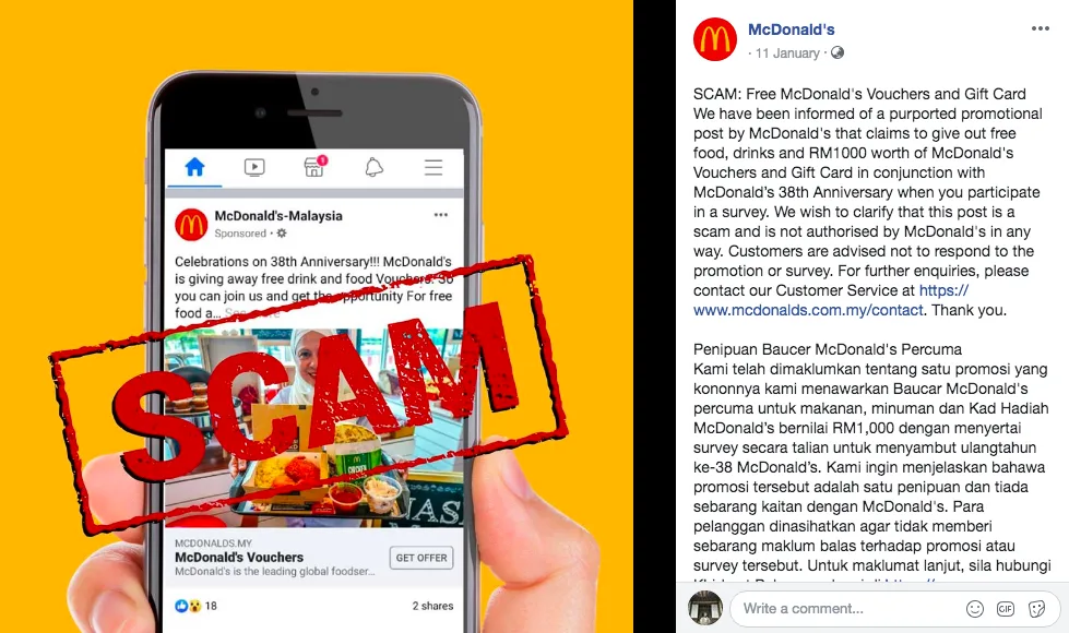 “We have been informed of a purported promotional post by McDonald’s that claims to give out free McDonald’s Gift Vouchers in conjunction with McDonald’s Malaysia’s 38th anniversary. We wish to clarify that this post is a scam and is not authorised by McDonald’s in any way. Customers are advised not to respond to the promotion or survey.”