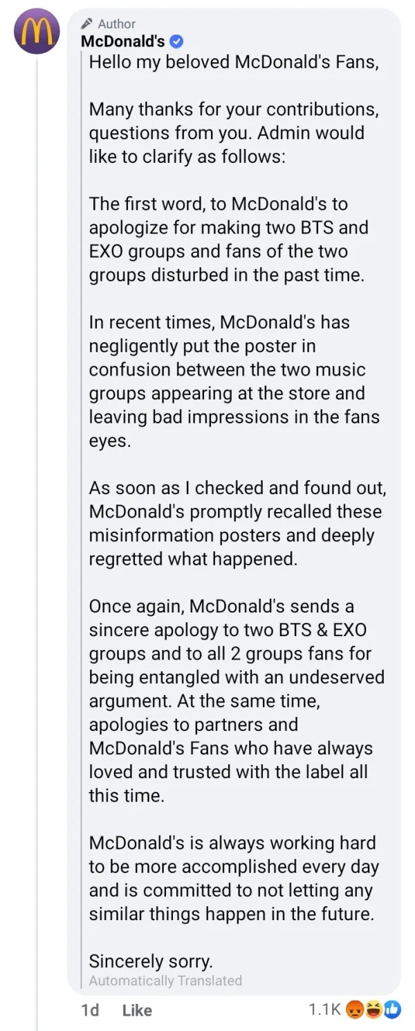 However, McDonald’s Vietnam made a glaring error by printing a promotional poster of another boy group, EXO (엑소). In case you didn’t know, the image used was the EXO in Dubai wallpaper. It didn’t take long before fans flocked to McDonald’s social media to demand a formal apology and a valid explanation.
