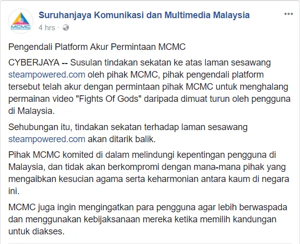 In an official statement on their Facebook page, they wrote wrote, “The platform operators have contacted us and have agreed with the MCMC’s request to block the ‘Fight of Gods’ video game from being downloaded by users in Malaysia. In effect, the MCMC has revoked the block on steampowered.com.”