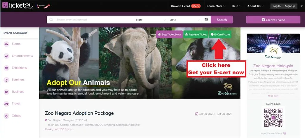 Kindly download “Adoption an animal e-certificate” at Ticket2U by key in your unique Ticket Number under the QR Code. To do so, click here.