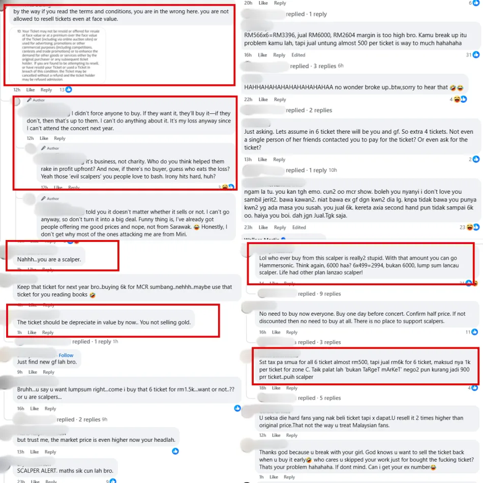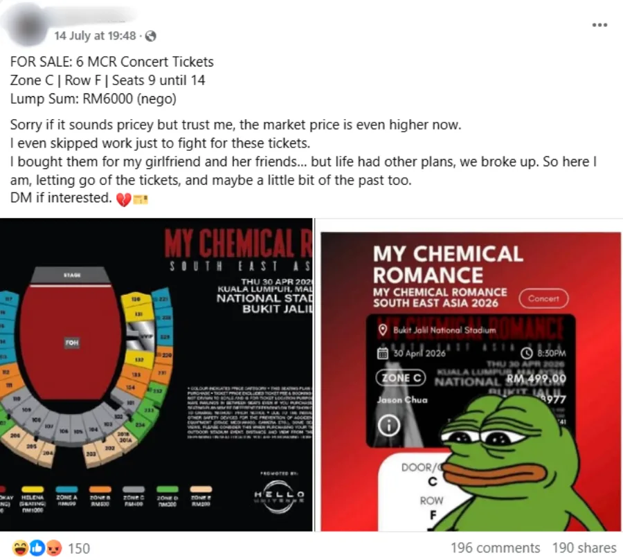 Earlier this week, a Facebook user named Jason posted online that he was reselling 6 Zone C MCR concert tickets for RM6,000. He explained that the decision to give away the tickets was due to a recent breakup. “I bought them for my girlfriend and her friends, but life had other plans; we broke up. So here I am, letting go of the tickets, and maybe a little bit of the past too,” he wrote.
