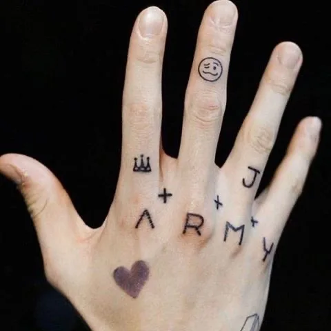 The ink on his right knuckles has two meanings. While one is, of course, BTS‘s fandom name ARMY, another one stands for each BTS members; A (V) – Taehyung, RM – Nam Joon (his stage name), MY– Min Yoon (Suga), JM– Jimin (connecting the letter J from his ring finger), and J – Jin, J-Hope and himself.