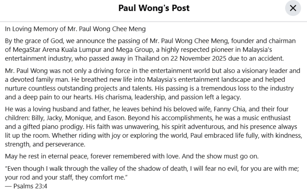 Paul’s family announced the devastating news through his Facebook page. The obituary writes, “By the grace of God, we announce the passing of Mr Paul Wong Chee Meng, founder and chairman of MegaStar Arena Kuala Lumpur and Mega Group, a highly respected pioneer in Malaysia’s entertainment industry, who passed away in Thailand on 22nd November 2025 due to an accident.”