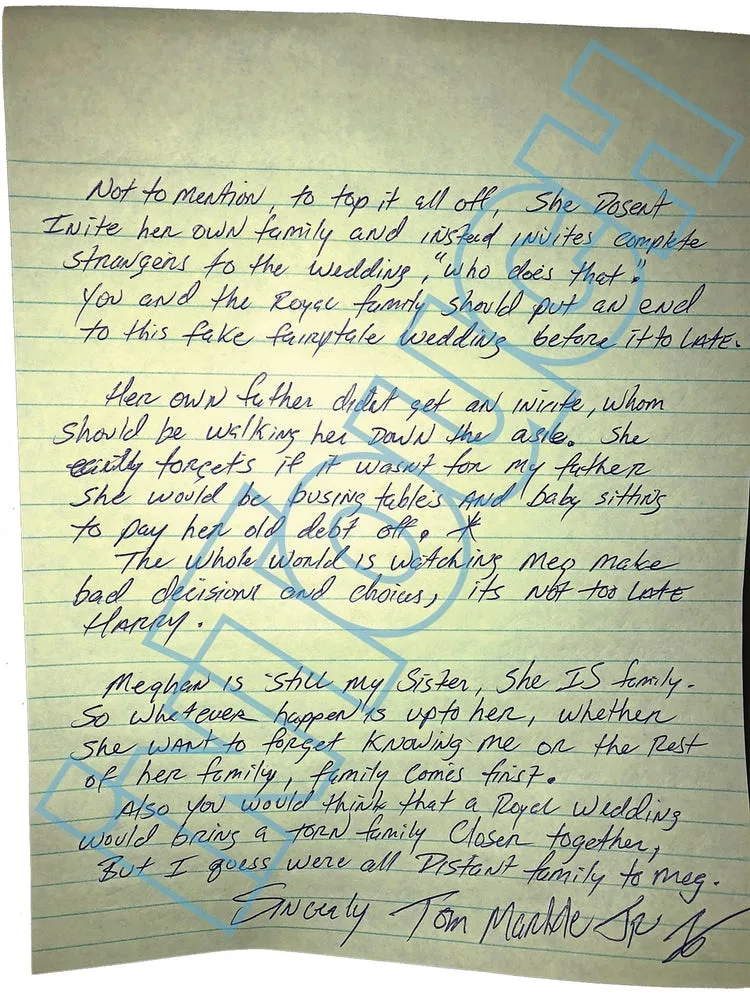 “It’s very apparent that her tiny bit of Hollywood fame has gone to her head. Not to mention, to top it all off, she doesn’t invite her own family and instead invites complete strangers to the wedding. Who does that? You and the royal family should put an end to this fake fairytale wedding before it’s too late.