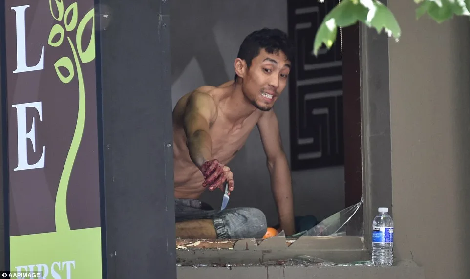 In a video of the seige, “Panjang” was seen at one time squatting on a window ledge, then erratically banging the weapon in his hand on a metal-sounding surface once inside.