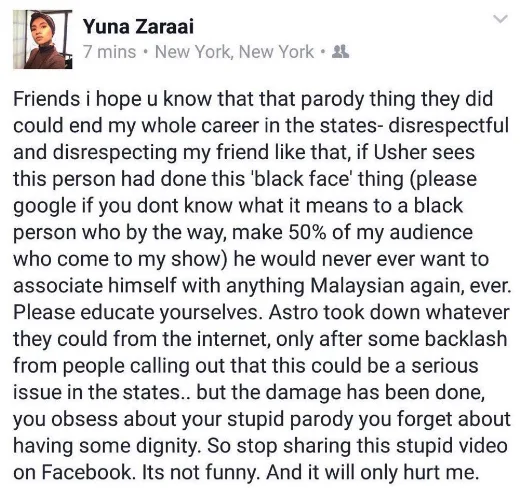 The local comedy show, which aired last week, featured comedian Shuk SYJ, who applied blackface makeup to appear as the African-American singer, while comedian Jihan Muse decided to channel her inner Yuna by attempting to imitate the singer’s fashion taste – headscarf, earrings and all.